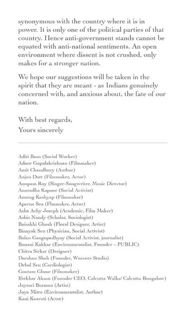 These are some of the statements made and questions asked in an open letter signed by social activists, filmmakers and artists like Adoor Gopalkrishnan, Mani Ratnam, Anurag Kashyap, Binayak Sen, Soumitro Chatterjee, Aparna Sen, Konkana Sen Sharma, Revathy, Shyam Benegal, Shubha Mudgal, Rupam Islam, Anupam Roy, Parambrata, Riddhi Sen to name a few.