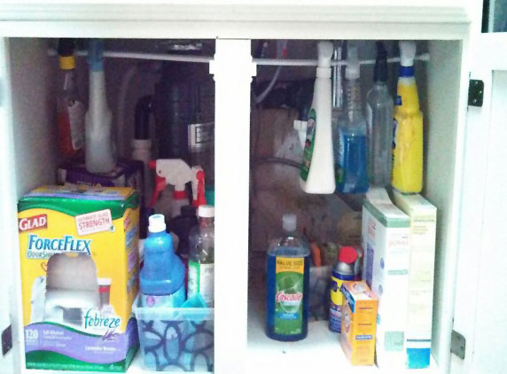 To fix this problem, try to get a tension rod fixed right beneath the sink across the walls. You can use the rod to hang bottles the ones pictured. Now you have all your bathroom supplies and cleaning supplies at one place. Never have to look around for them again. Handy ain't it?