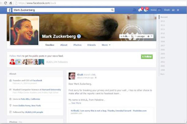Khalil responded by taking his demonstration to the next level; if posting on one of Mark Zuckerberg’s friend’s walls didn’t get his point across, perhaps posting on Zuck’s own wall would?